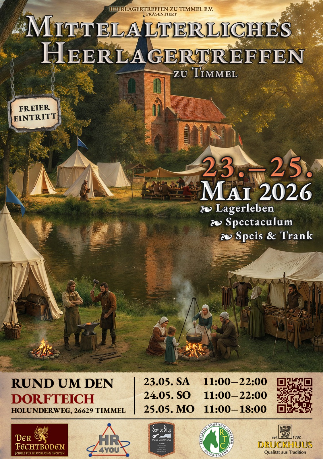 Jedes Jahr zu Pfingsten begibt es sich aber, das der Heerlagervogt zu Timmel am Dorfteich die Lager um sich schart. Seien es Wikinger aus dem rauen Norden, Ritter von edelem Geblüt, Landsknechte und Kreuzfahrer, einfache Leute und Handwerker, Krämer, die ihre Waren feilbieten, Schmiede, Gaukler und Musikanten. Seyd ihr nur auf der Suche nach Zerstreuung und möchtet Euch ein wenig Ablenkung vom tristen Alltag gönnen? So wissed, alle sind geladen, sich in Timmel am Dorfteich ein Stelldichein zu geben, um gemeinsam bei Braten und Wein, Weib und Gesang, sich selbst und dem nächsten gefällig zu sein. Da keinerlei Wegezoll erhoben wird ist es für aller Welt erschwinglich. Kommt und seyd dabei, wenn wir gemeinsam das Mittelalter erwecken und auf´s trefflichste feiern.